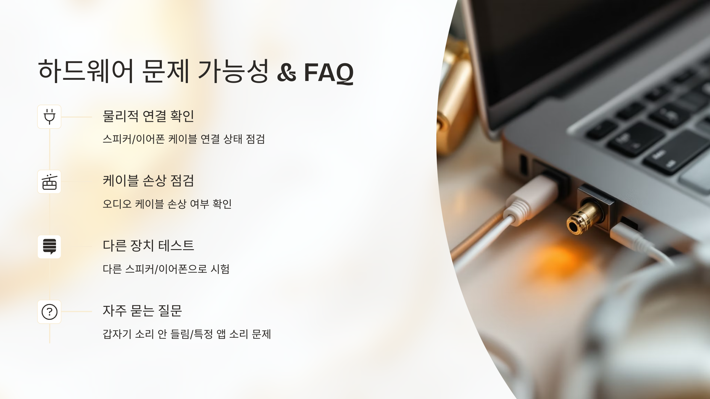 다른 장치를 연결해서 소리가 나면 기존 장치 문제고, 어떤 장치에서도 안 들리면 내부 사운드 칩셋 고장일 수도 있어요. 이럴 땐 서비스센터 점검이 필요해요. 🧰