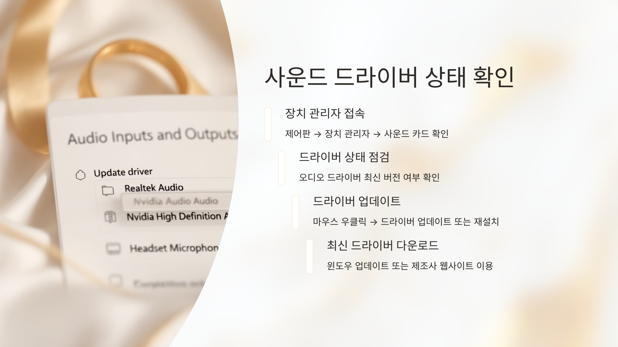 드라이버는 소리 출력을 담당하는 중간 연결자 역할을 해요. 만약 드라이버가 손상되었거나 비활성화되어 있으면 아무리 볼륨이 켜져 있어도 소리가 나지 않아요.